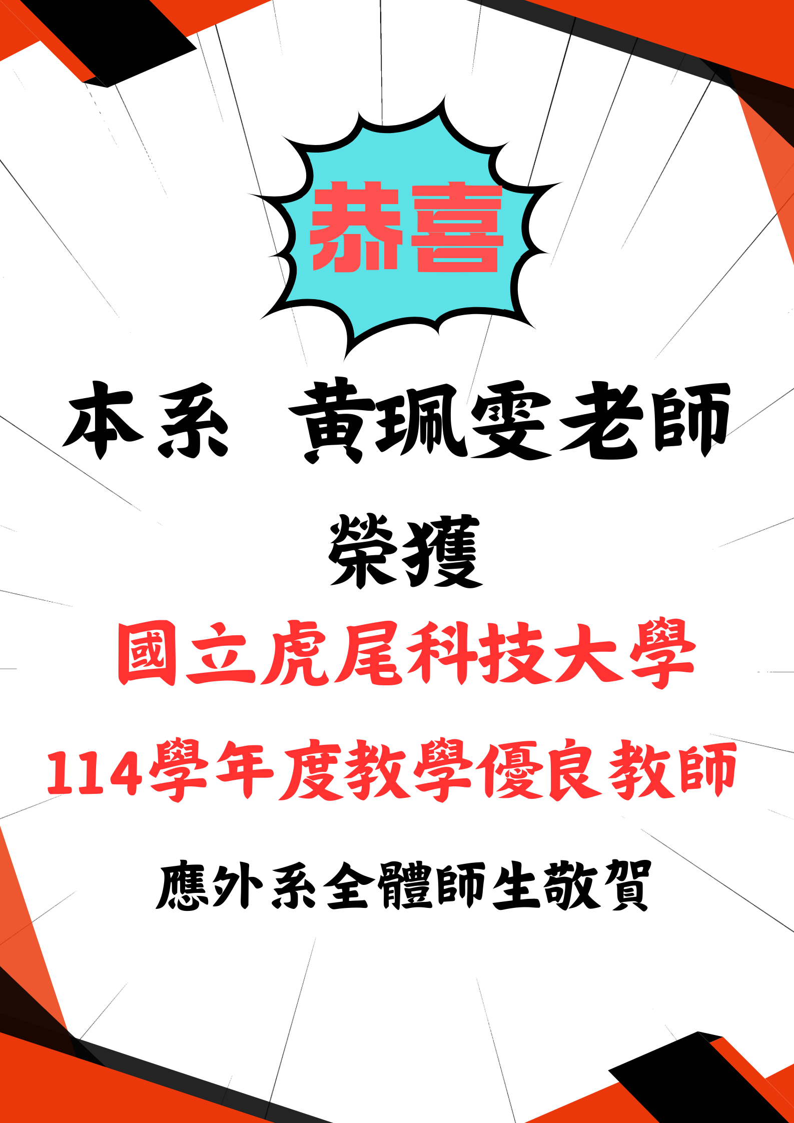 [系上公告]恭喜 本系黃珮雯老師 榮獲國立虎尾科技大學114學年度教學優良教師
