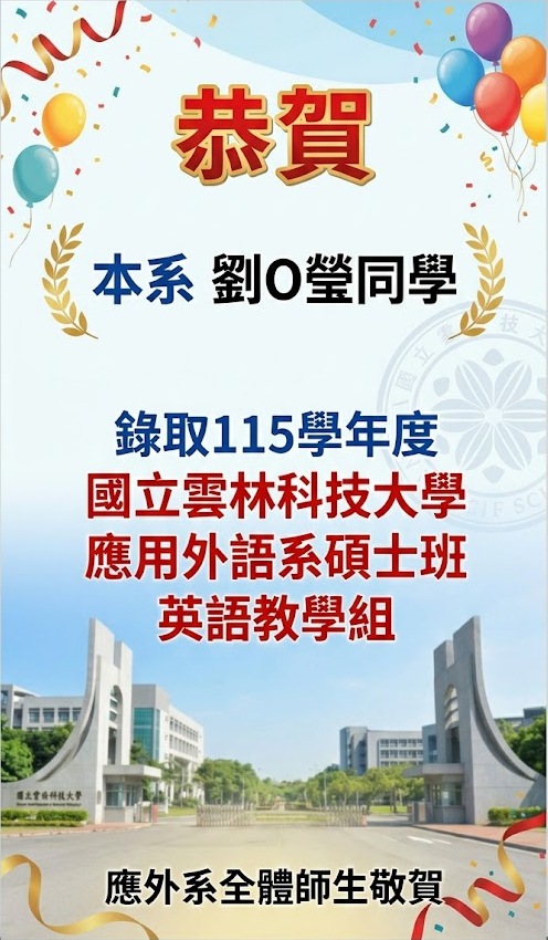 [系上公告]恭喜 本系 劉O瑩 錄取國立雲林科技大學應用外語系碩士班英語教學組!
