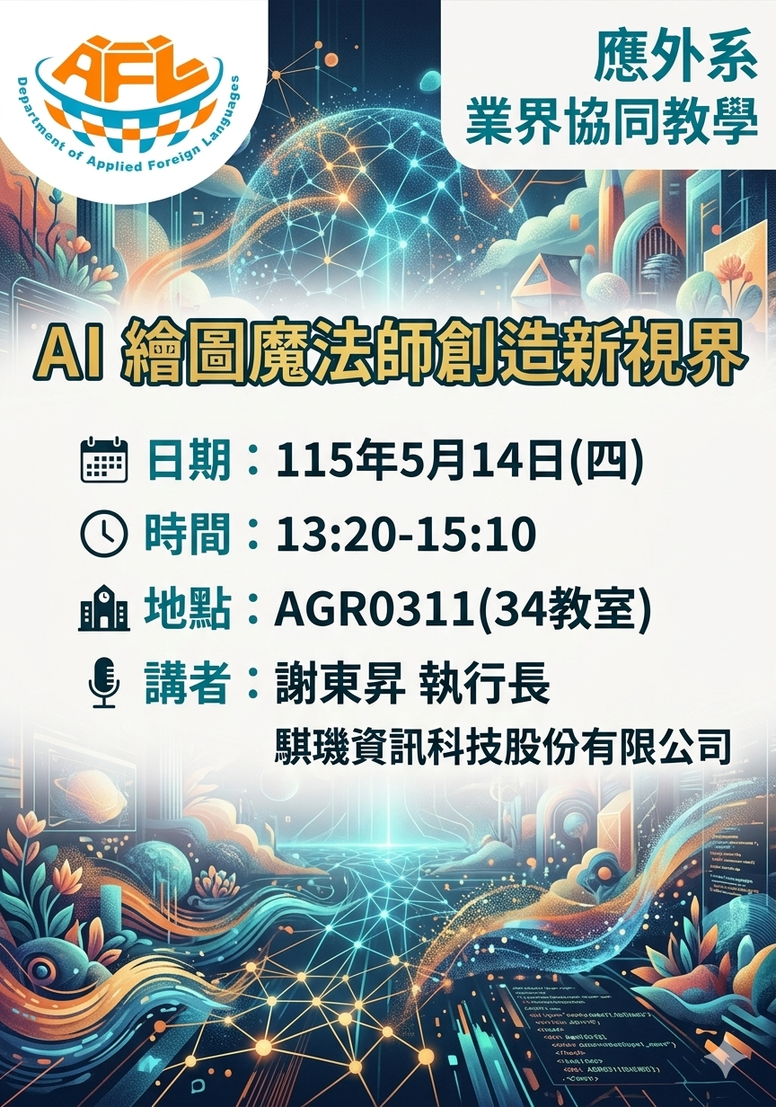[系上公告] [協同教學]2026.05.14 資訊科技應用 AI繪圖魔法師創造新視界(分享者: 謝東昇執行長)