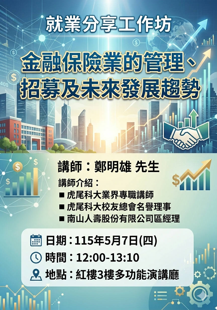 [系上公告]2026.05.07 就業分享工作坊-金融保險業的管理、招募及未來發展趨势(分享者: 鄭明雄 先生)