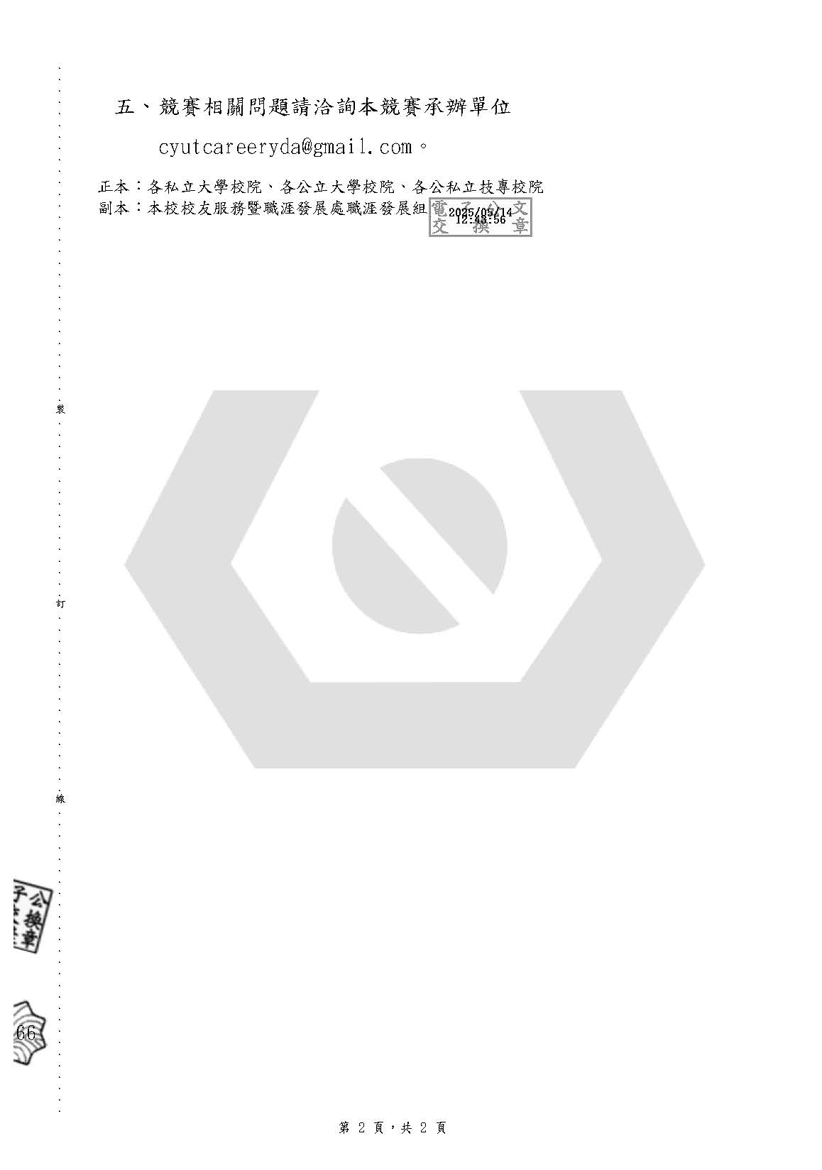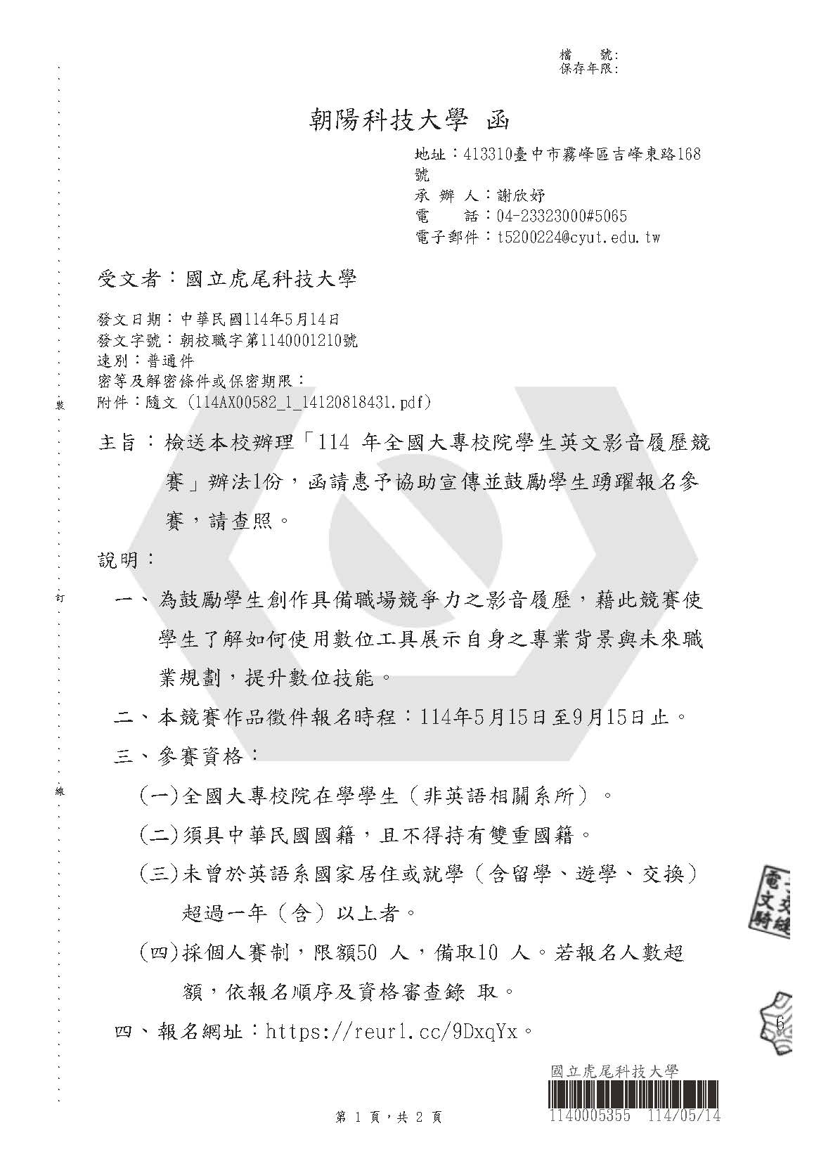 朝陽大學辦理114 年全國大專校院學生英文影音履歷競賽