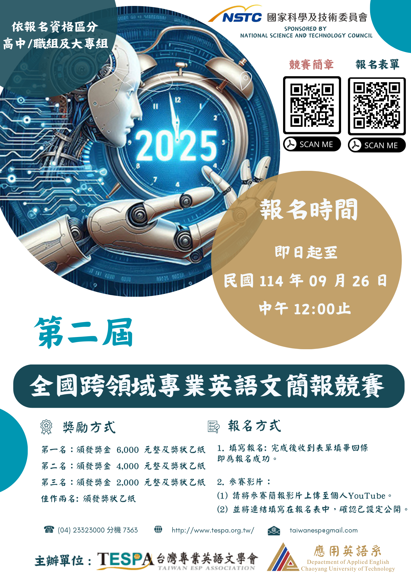 朝陽科技大學應用英語系辦理第二屆全國跨領域專業英語文簡報競賽